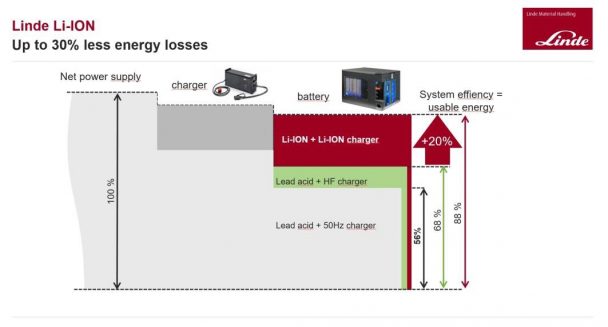 The high energy density, fast charging, long service life, low self-discharging rate and the option of discharging the battery down to approx. 5% of residual SOC without affecting performance all mean a significant rise in efficiency. In comparison to the full 6 – 12 hours charging time of traditional batteries, the lithium-ion battery can be fully charged in less than 90 minutes. The charging-time strongly depends on the used battery and charger combination. Quick interim charging is also possible, which means there is no battery change needed — a decisive advantage, particularly for intensive multi-shift use. Maintenance costs and effort are also reduced: no need to refill with water, no gases/acids are emitted and therefore no associated investment for battery charging is required. In summary there's: